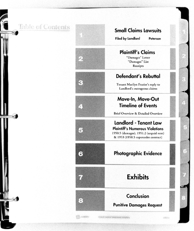 Thus, without a highly organized presentation folder, Marilyn would never have had a chance against her landlord, who had won previous lawsuits against his former tenants. I can’t stress enough the importance of being organized, and in fact, being organized in a certain order. Judges don’t want to spend time trying to figure out your evidence. You must “spoon feed” the judge and make it absolutely as simple as possible for him to clearly see that the landlord violated your rights as a tenant and that the landlord’s claims are fabricated. A properly organized presentation folder will do that.
