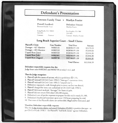 Since this is your case, take your time and do your very best. Ask for help if you need it. Remember, I put in over 200 hours to ensure Marilyn would win in court. Presentation is everything: our landlord walked in with a large handful of pictures and a bunch of loose papers. Whose presentation do you think got more attention and respect? Marilyn and the landlord only spoke a couple of sentences to the judge for a couple of minutes before he dismissed them our victory was accomplished through our presentation folder.