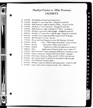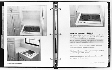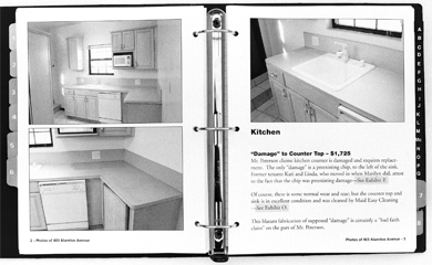 · Photographic Evidence. You would probably think this would come sooner in the binder, but it’s down this far for a reason: argue law first, claims second. Besides, once it is apparent that the landlord violated many of your rights as a tenant, the photo evidence becomes icing on the cake. Of course, there is some strategy to the layout of the photos as well: first, start with the most obvious and outrageous fabrications so the judge immediately realizes your landlord has no credibility. Next to the pictures, state exactly what the landlord’s claim is, where the judge can find the landlord’s claim within the landlord’s list of damages (cite page and paragraph numbers), and conclude with your rebuttal. Also notice in our presentation that the pictures “face” each other, meaning they appear on both sides of the open presentation folder. This is deliberate: more information can be visually processed at the same time, making your claims more believable. Finally, if you can find someone to lay out the pictures in a software program such as Adobe InDesign so you can type text next to the photos and then print the resultant pages onto glossy paper, your presentation will be slick, slick, slick!