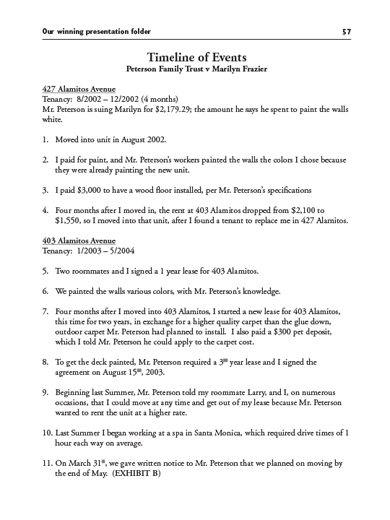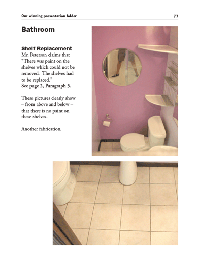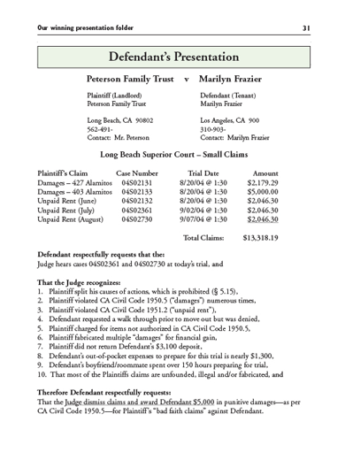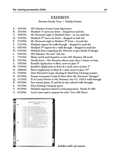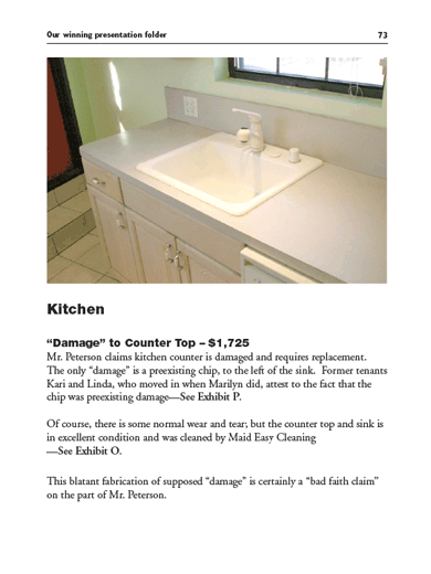 The eBook contains all of what's on this web site (Preface, Foreword, Introduction, Part I, and Part II) and also all of Part III—Our winning presentation folder. The eBook is 7" X 10" and can be either read on your computer screen, or printed onto paper. It's 126 pages total, with most of it being our actual presentation folder (over 90 pages is the presentation folder we presented in court). Also included are quite a few actual Microsoft Word documents I created for the presentation folder. Just swap out our info for your own. Learn today, win tomorrow!